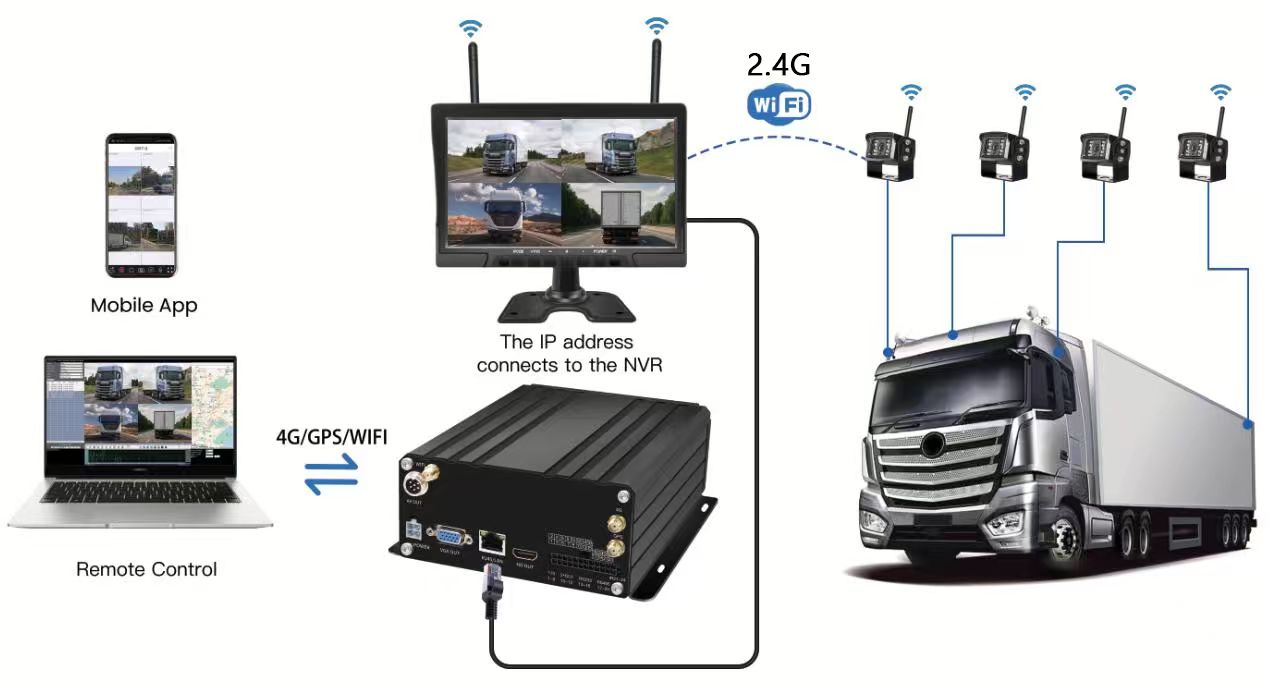 Carleader 10,1 tuuman 4CH Wireless HDD Mobile NVR System, huippuluokan mobiili NVR-järjestelmä, joka on suunniteltu kaluston hallintaan. Järjestelmä käyttää 4 kpl langatonta IP-kameraa, jotka muodostavat pariliitoksen 10,1 tuuman langattoman näytön kanssa 2,4 GHz:n signaalilla, ja yhdistä sitten monitori ja NVR RJ45-liittimellä. ei tarvita ylimääräisiä johdotusongelmia, tehokkaampi asennus ja kaluston hallinta.