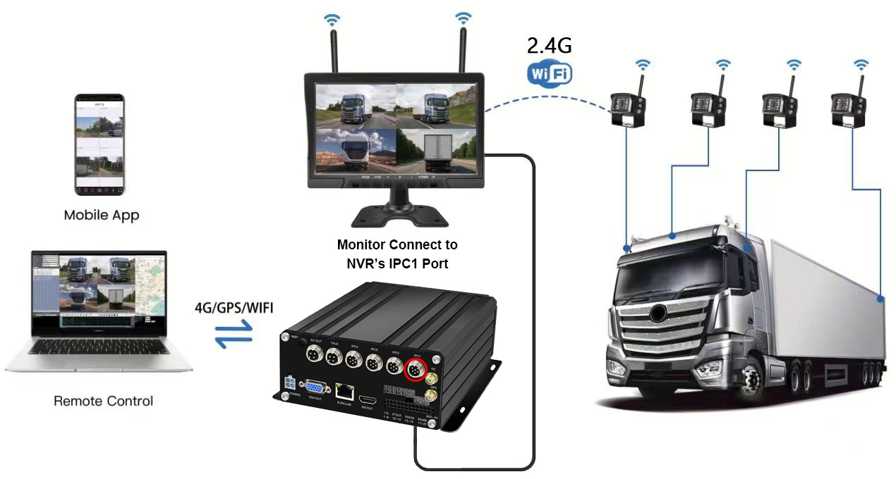 Ylimääräiset 3-kanavaiset langalliset IP-kameratulotCarleader 10,1 tuuman 7CH Wireless HDD Mobile NVR System, huippuluokan mobiili langaton NVR-järjestelmä, joka on suunniteltu kaluston hallintaan. Järjestelmä käyttää 4 kpl langatonta IP-kameraa, jotka on liitetty pariksi 10,1 tuuman langattoman relemonitorin kanssa 2,4 GHz:n signaalin kautta. Liitä sitten relemonitori ja NVR IPC -portti 6PIN-ilmailuliittimen kautta. Tukee myös ylimääräisiä 3-kanavaisia langallisia IP-kameratuloja.