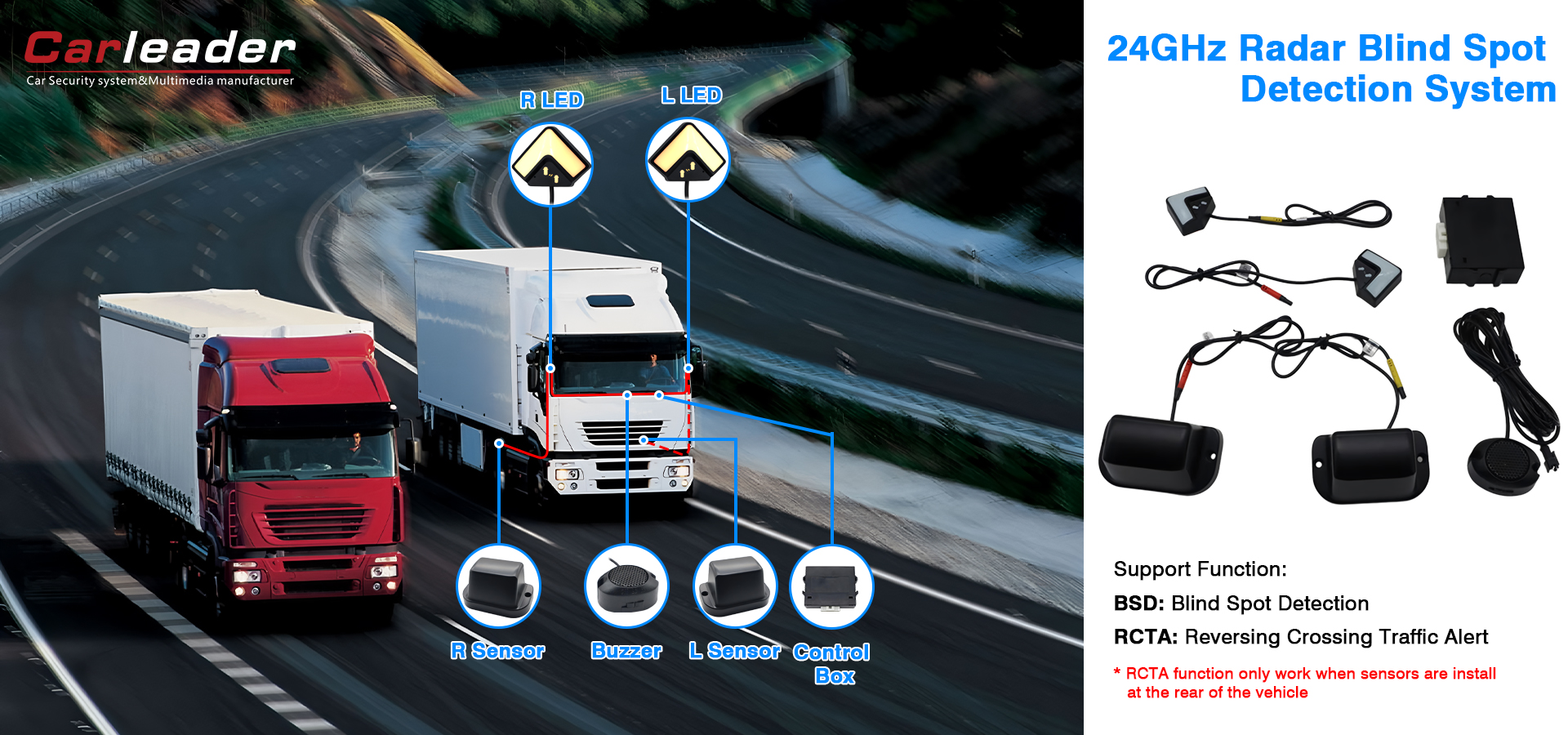 1080P vedenpitävä takakamera automaattisella sulkimellaCarleaderin 24 GHz: n tutka-anturin sokean alueen havaitsemisjärjestelmä käyttää 24 GHz: n millimetrin aaltotutkan tekniikkaa ja supertietokonetekniikkaa suorittaakseen datan supertietokoneen nopean ajomatkan aikana, havaitse etäisyys vasempaan ajoneuvoon ja takaosan nopeaa ajoneuvoa ja havaitse ajoneuvo reaaliajassa. Kun ajoneuvo on vaarallisessa sokeassa pisteessä, 24 GHz: n millimetritutkauton BSD -sokean pisteen havaitsemisjärjestelmä käyttää summeria ja LED -ääntä ja kevyttä hälytystä ilmoittamaan kuljettajalle nopeasti toteuttavan tarvittavat toimenpiteet onnettomuuksien välttämiseksi.