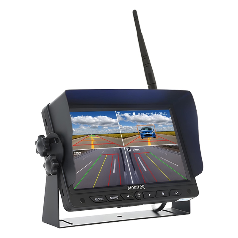 Carleader 7 tuuman BSD BSD Blind Spot Detection Wireless Monitoring System, digitaalinen langaton kamerajärjestelmä, joka on integroitu AI-tunnistustoimintoon, tukee jalankulkijoiden ja ajoneuvojen tunnistusta ja hälytystä, varoittaa kuljettajaa ajoneuvoa ympäröivästä tilanteesta. Jopa 4 kanavaa 720P langattomien kameroiden automaattista pariliitosta, jokainen kanava tukee AI-tunnistustoimintoa. Tarkkaile sisäänrakennettua AI-kalibrointivalikkoa tunnistusalueen koon säätämiseksi todellisen asennusasennon ja kulman mukaan. Näyttö Tukee valinnaista silmukkatallennustoimintoa, tukee jopa 256 Gt:n SD-kortin tallennustilaa.