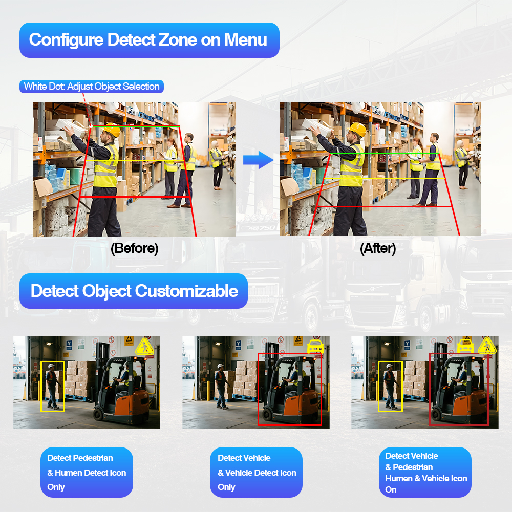 AI kuolleen kulman havaitsemisperustakamera Sisäänrakennettu väriä muuttava varoitusvaloAI kuolleen kulman tunnistuskamerajärjestelmän sisäänrakennettu värinmuutosvaroitusvalo on älykäs ajoneuvon turvasarja, joka sisältää AI BSD-kameran ja AI-näytön, jotka tukevat AI-kalibrointiasetusta. Käyttäjä voi muuttaa tekoälyasetuksia, kuten tunnistusalueen koon säätöä, valittavissa olevaa äänihälytystyyppiä, jalankulkijoiden havaitsemista päälle/pois, ajoneuvon tunnistuksen päälle/pois ja kaikki muut kalibrointiasetukset.