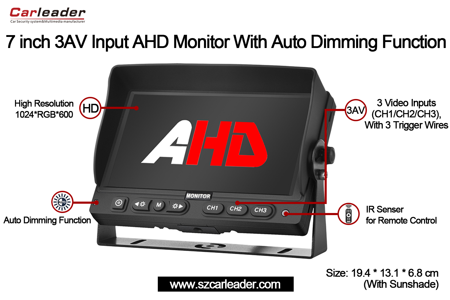 Täydellinen laivaston hallintaan, tietoturvavalvontaan tai teollisuuskäyttöön, Carleader 7 tuuman 3CH AHD -ajoneuvomonitori yhdistää luotettavuuden, monipuolisuuden ja käyttäjäkeskeisen innovaation pienikokoisessa muodossa.