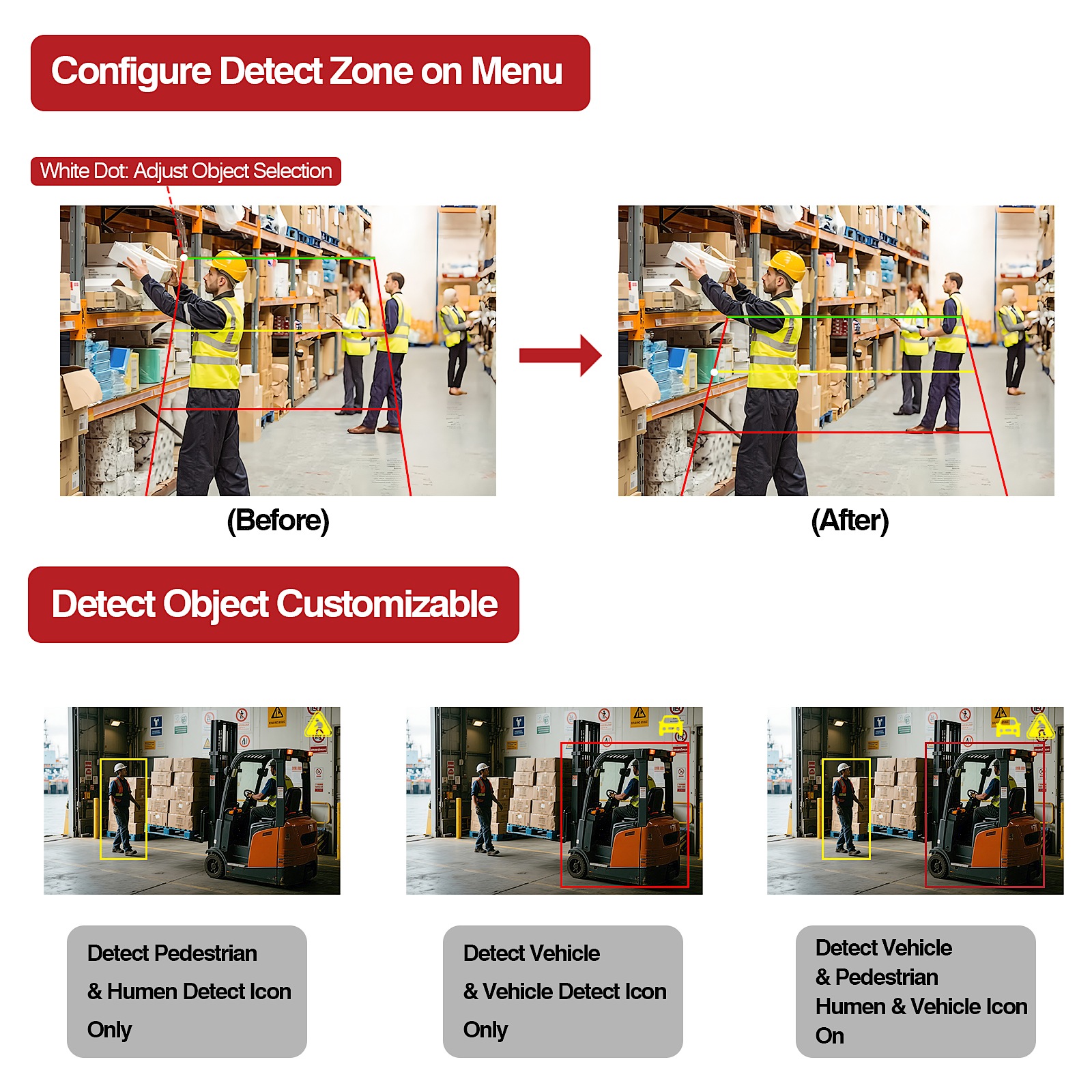 1.Varjaiden AI-havaitsemisvalvontajärjestelmä U-muotoisella varoitusvalolla haarukkatrukille, joka on suunniteltu erityisesti 24 V: n ajoneuvoille, leveä jännite DC12-32V-tulo.