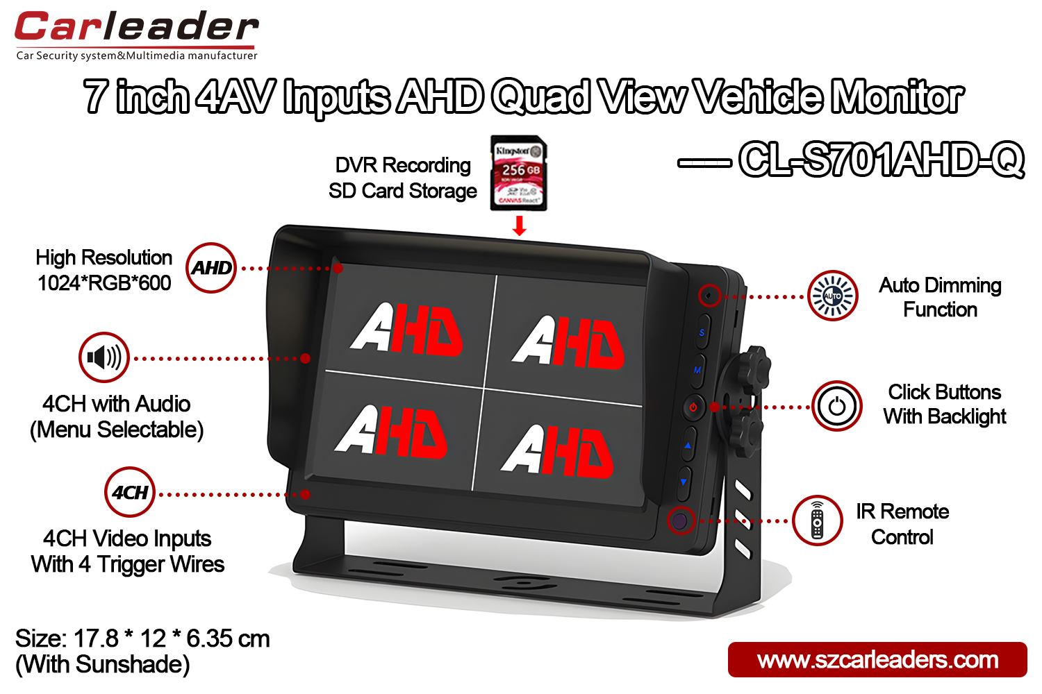 Carleader esittelee sinulle ylpeänä meidän7 tuuman 4CH AHD-tulot Nelinäkymän näyttö, Quad View -suunnittelu tukee neljää kanavaa ajoneuvon kameralle, kuten etunäkymä, sivunäkymä x2, takanäkymä, mahdollistaa suurten ajoneuvojen (linja-autojen, kuorma-autojen ja pakettiautojen) kuljettajien tarkkailla useita näkymiä ympäristöstään ajoneuvoa käyttäessään.