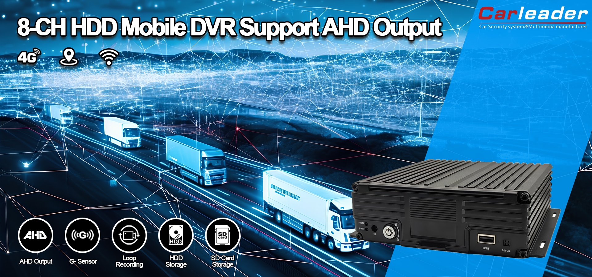 Carleader8CH 1080P HDD Mobile DVR tukee AHD-lähtöäon korkean suorituskyvyn 8-kanavainen Mobile Digital Video Recorder (MDVR), joka tukee AHD-signaalilähtöä. Se on suunniteltu luotettavaan ja edistyneeseen ajoneuvon valvontaan ja tiedonhallintaan. Se on suunniteltu täyttämään kalustonhallinnan, kuljetusten turvallisuuden ja mobiilitallennussovellusten vaativat vaatimukset, ja siinä yhdistyvät vankka laitteisto älykkäisiin ohjelmistoominaisuuksiin.