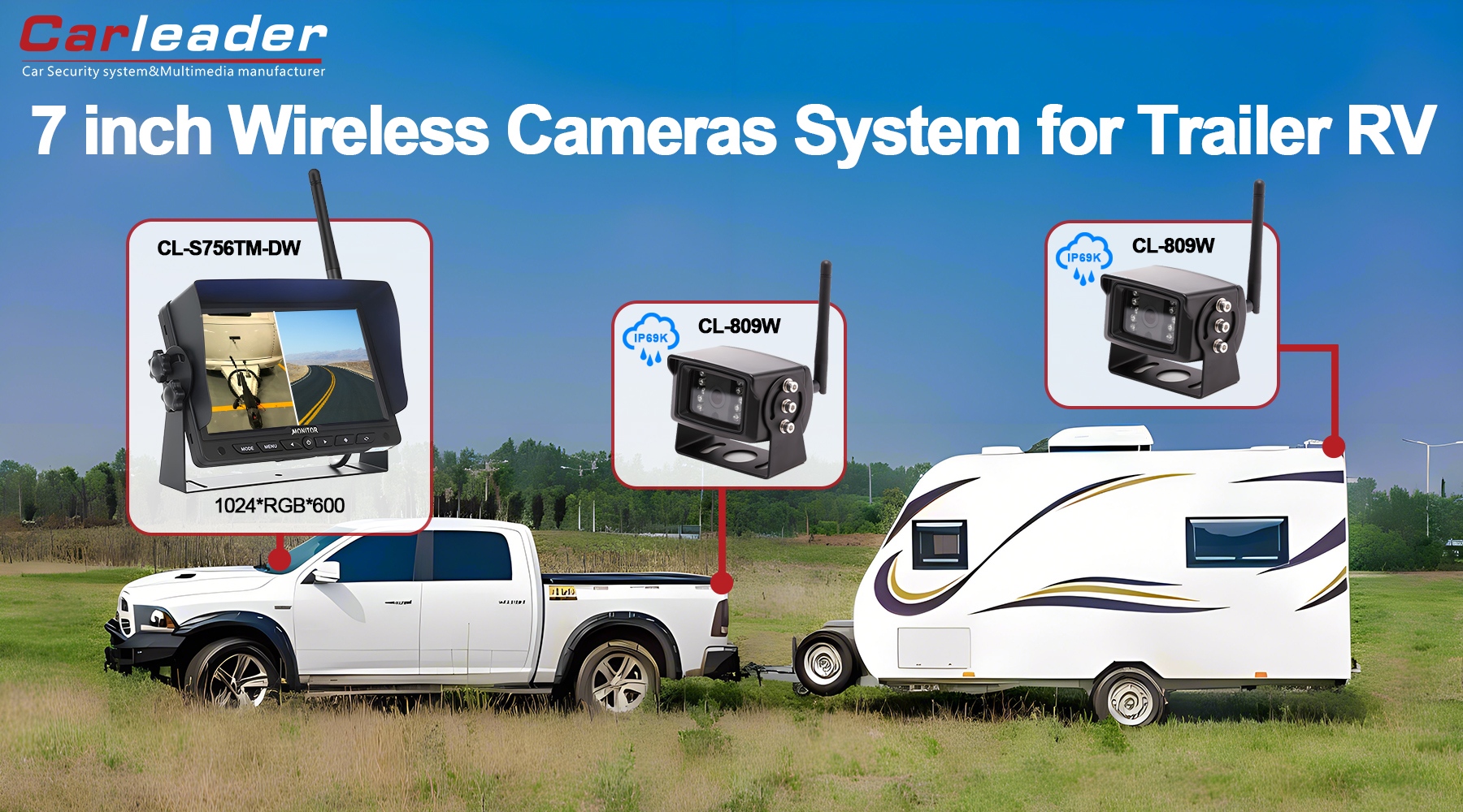 Carleader7 tuuman 2,4 G:n digitaalinen langaton 2-kanavainen jaetun näytön kamerajärjestelmä, Korkean suorituskyvyn langaton valvontajärjestelmä, joka tukee 2 liukunäytön näkymää, yhdistettynä 2 kpl langattomaan kameraan. 7 tuuman digitaalinen paneeli, 16:9 kuvasuhde, 1024 x 600 (RGB) -resoluutio takaavat kuljettajalle selkeän ajokokemuksen.