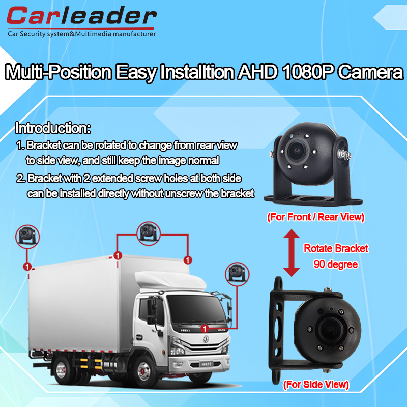 CarleaderAHD Heavy Duty Vehicle -etu-/sivu-/takakamera, jossa on kiinnikkeen asennusreikä ylhäällä, alas, oikealla ja vasemmalla, mikä mahdollistaa kameran säätämisen kameran kiinnikkeen sopimaan eri kameran asentoihin, kuten etu-, sivu- ja takanäkymään, tekevät tästä kamerasta yhteensopivamman ajoneuvon turvavalvontajärjestelmän kanssa.