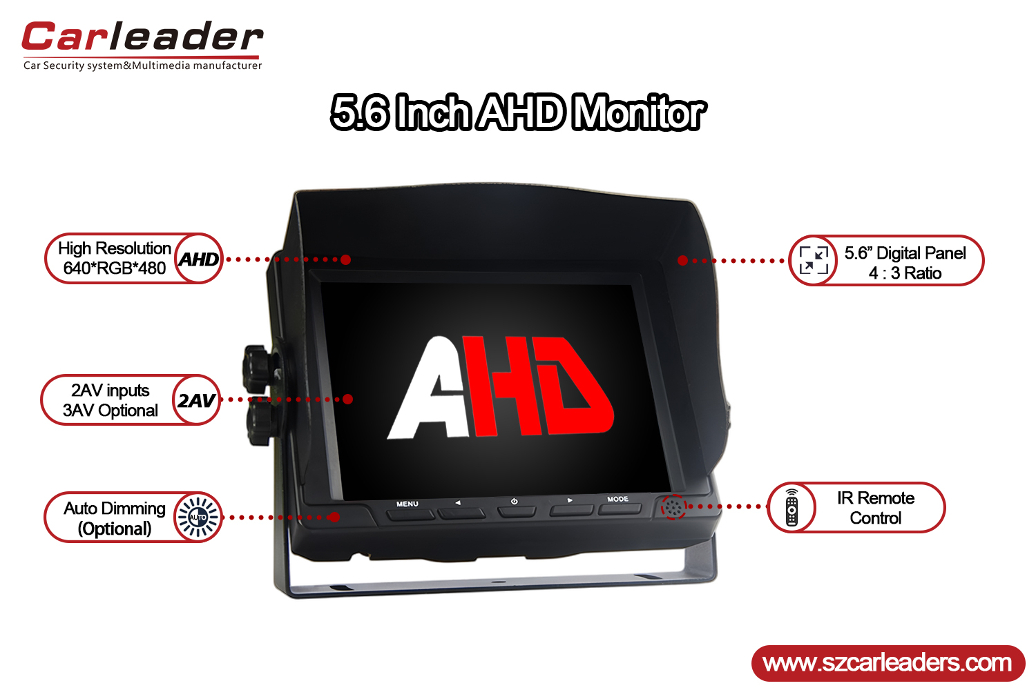 Carleader5,6 tuuman 2-kanavainen AHD-tulojen ajoneuvon varamonitorion ammattitason 5,6 tuumaaAHD-taustanäyttö, suunniteltu antamaan selkeä ja luotettava kuva ajoneuvojen turvallisuudesta ja valvontajärjestelmistä. Modernin muotoilun ja vankan toiminnallisuuden ansiosta se on ihanteellinen ratkaisu kaupallisiin ja yksityisiin ajoneuvoihin, jotka vaativat luotettavaa taaksenäkyvyyttä.