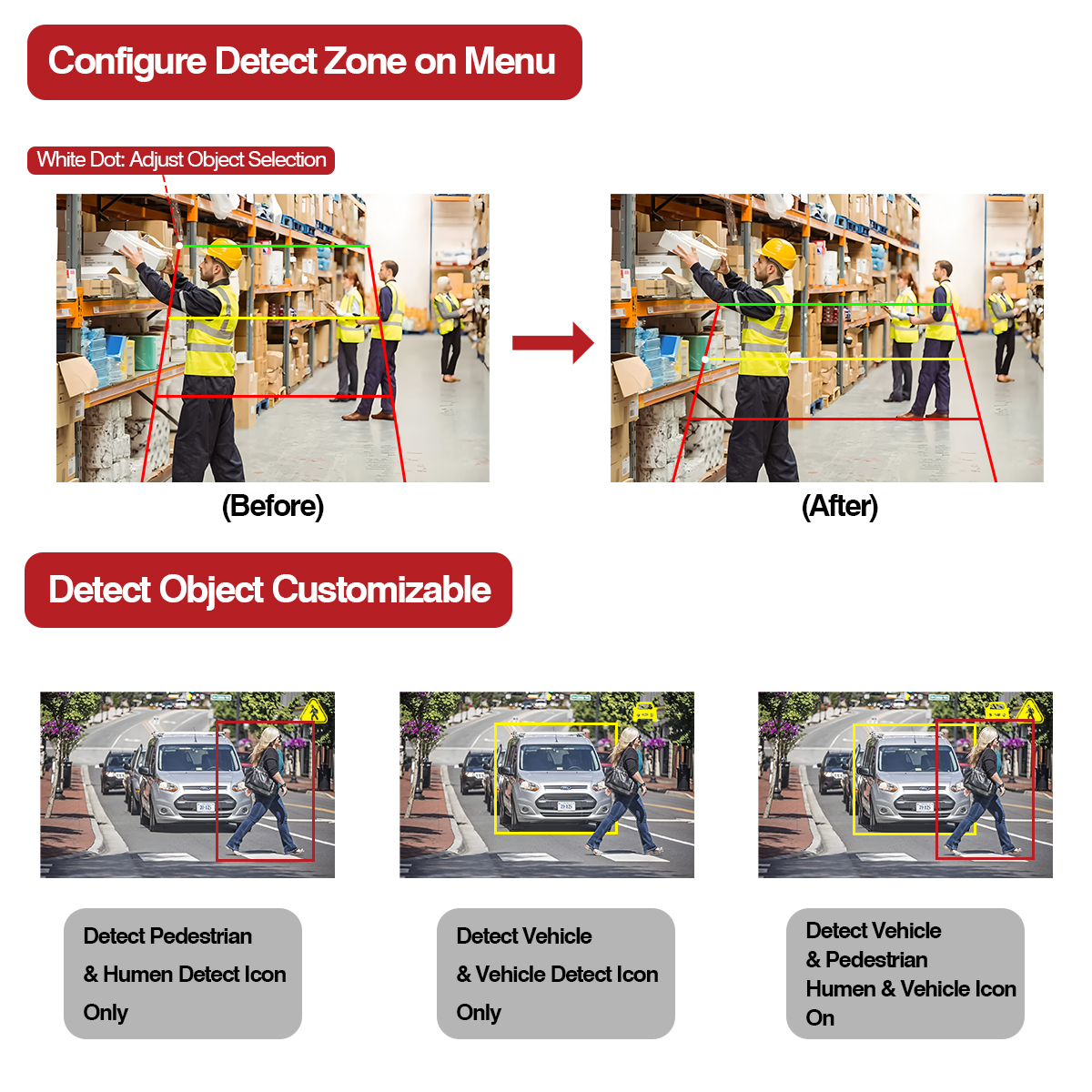 Tämä AI-kamera, jossa on sisäänrakennettu varoitusvalotoiminto, valon väri muuttuu vastaavaksi, kun tunnistuskohde saapuu eri tunnistusalueelle (punainen, keltainen, vihreä). Integroi myös jalankulkijaa ja ajoneuvoasi lähellä olevaa ajoneuvoa ympäröivään hälyttimeen.