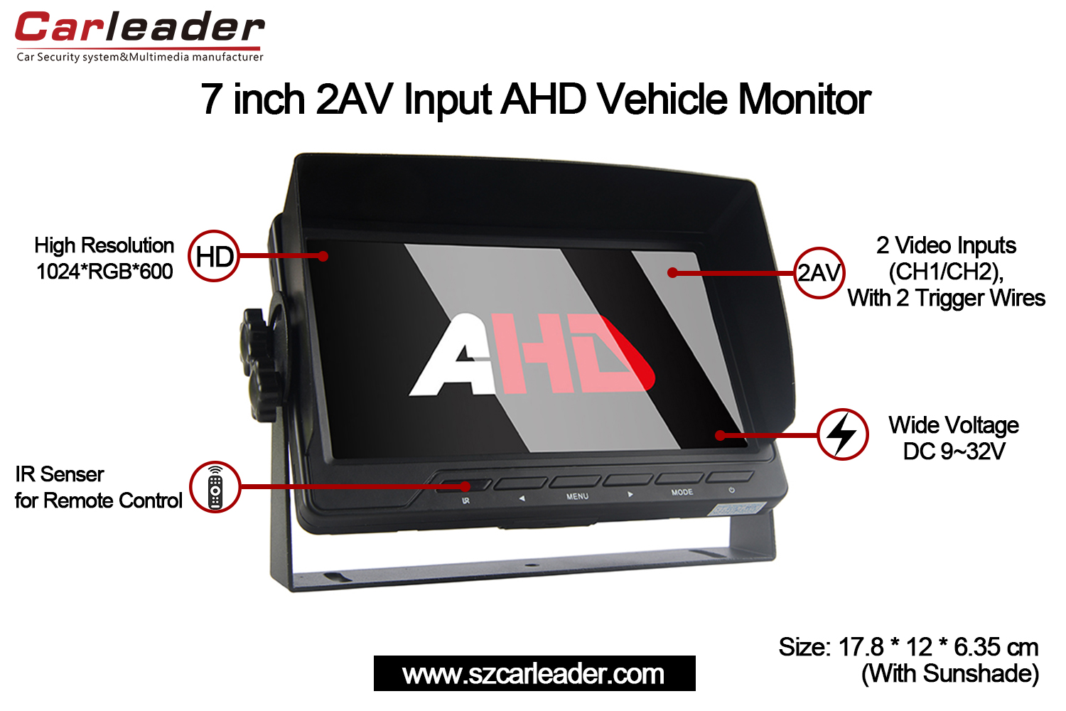Carleader7 tuuman AHD 2-kanavainen ajoneuvonäyttöyhdistää luotettavuuden, selkeyden ja monipuolisuuden kompaktissa ja kestävässä suunnittelussa, mikä tekee siitä erinomaisen valinnan ammattimaisiin ja henkilökohtaisiin ajoneuvojen valvontatarpeisiin.