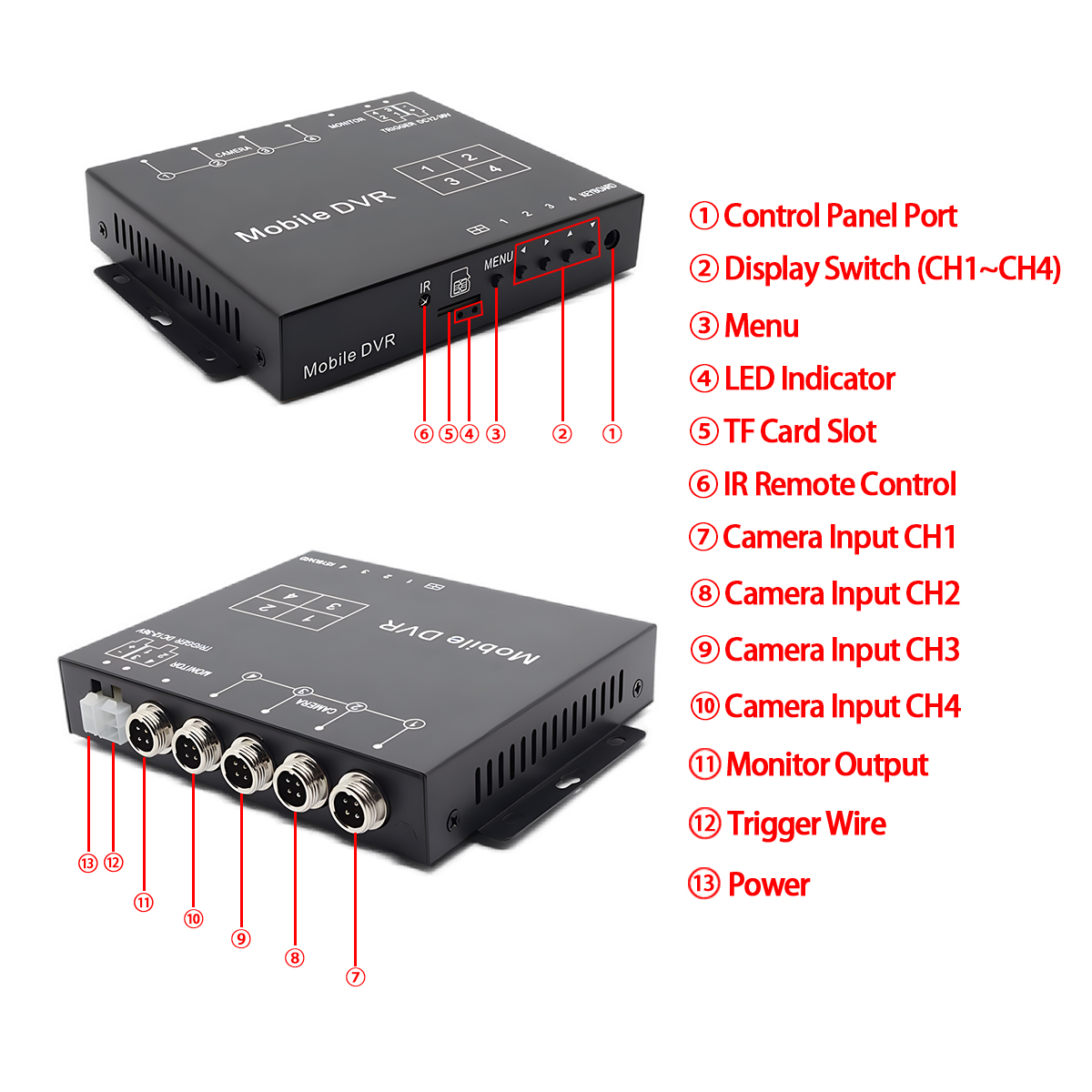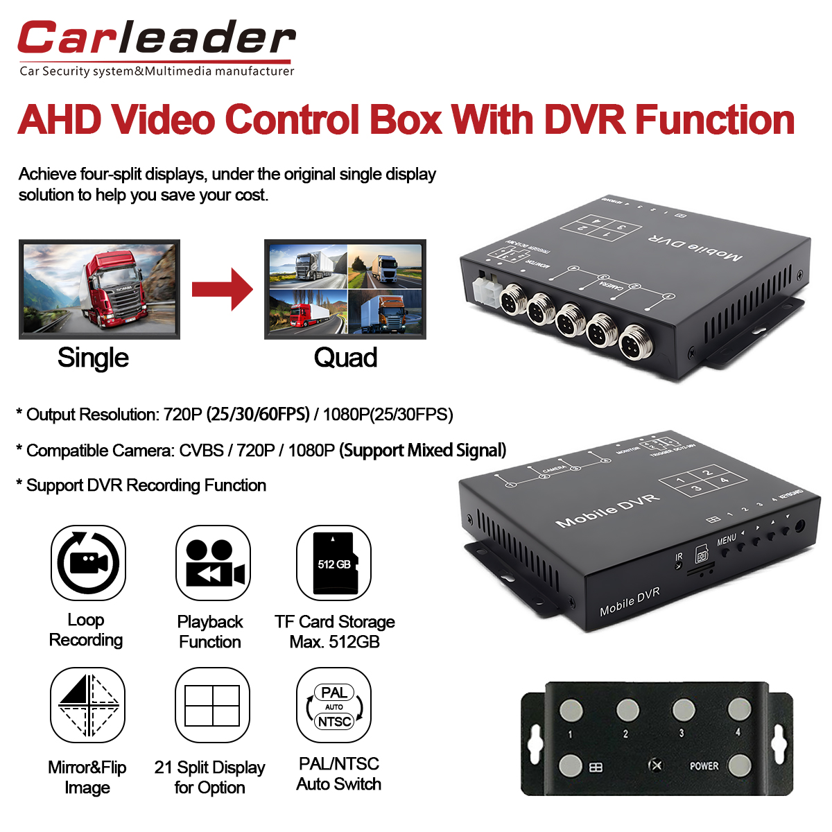 Carleader Quad Video Splitter Box yhdistää 4CH-videonjakolaatikon mukavuuden ja DVR-tallennustoiminnon turvallisuuden. Sen kattava ominaisuussarja, mukaan lukien erilliset kuva-asetukset, joustavat laukaisutilat (liipaisujohto ja kaukosäädin), näytön reunan säätö, laaja jännitesyöttö ja vankka suojaus – tarjoaa luotettavan ja laadukkaan valvontaratkaisun, joka on räätälöity vaativaan mobiiliympäristöön. Varmista täydellinen tilannetietoisuus ja suojatut videotodisteet Carleader 1080P AHD Quad Split Display -videoprosessorin tuella videotallennuksella.