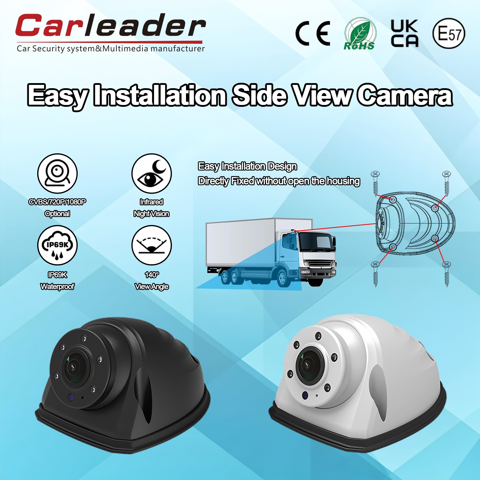 CarleaderAHD Quick Installation Heavy Duty -sivukamera valkoinenon tehokas sivukuva AHD-kamera, joka on suunniteltu tarjoamaan selkeää näkyvyyttä kaikissa ankarissa sääolosuhteissa. Pääasiassa monitoimiseen ja kestävään suorituskykyyn suunniteltu kompakti kamerajärjestelmä soveltuu hyötyajoneuvoihin, teollisuuslaitteisiin ja turvasovelluksiin, joissa tarvitaan selkeää reunanäkymää.